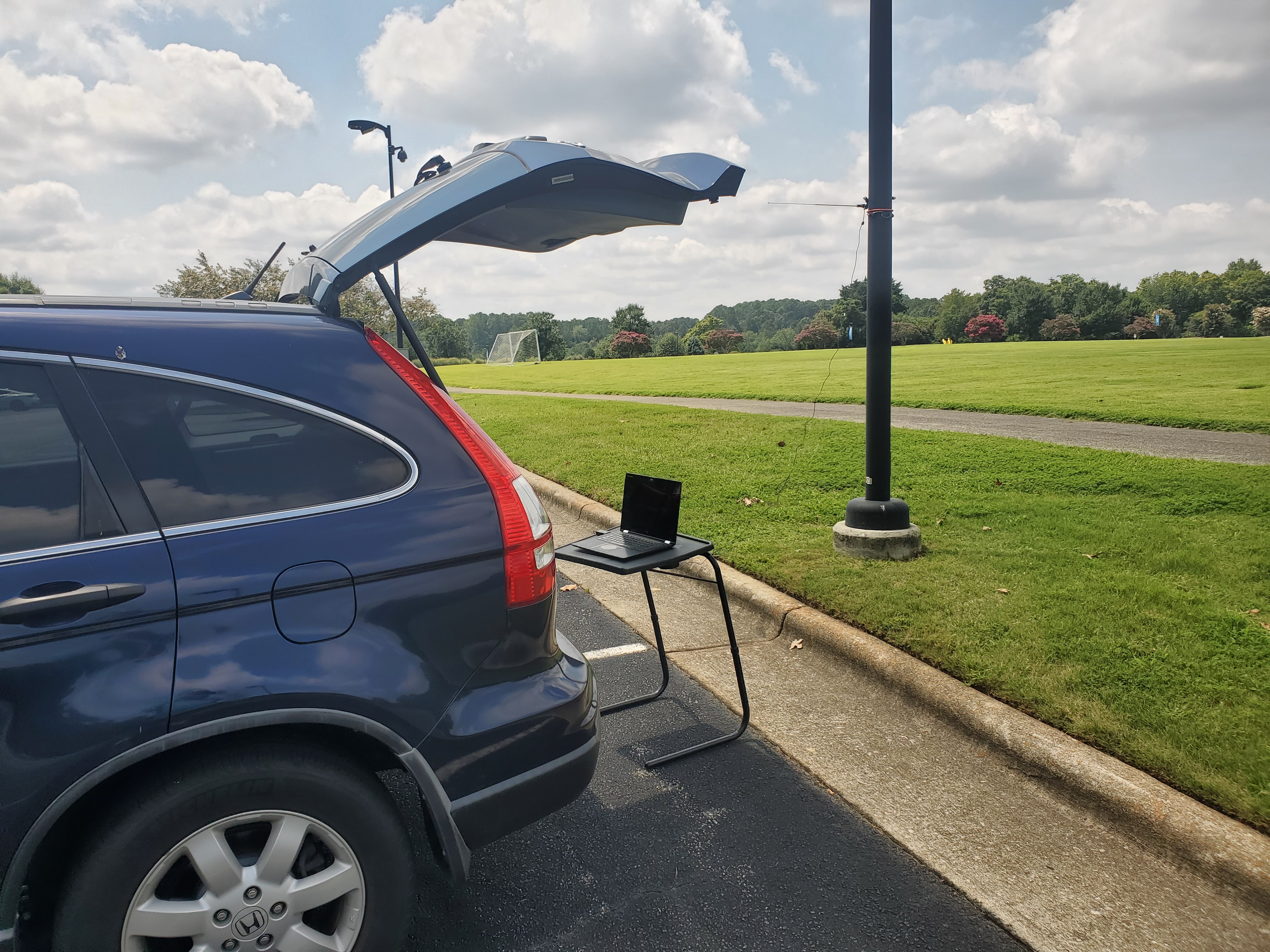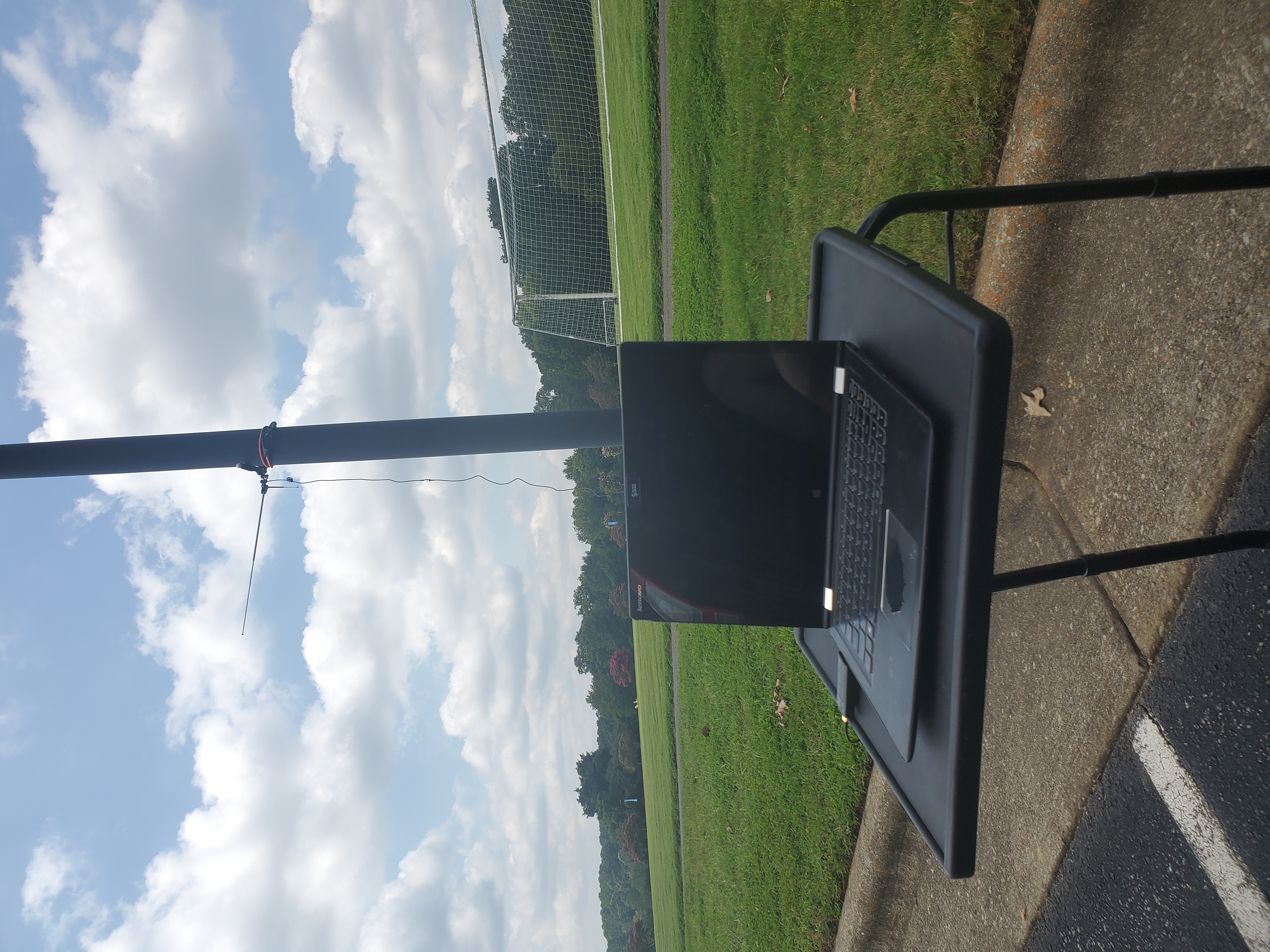 With that in mind, I normally take my laptop, dongle, and dinky little antenna out to a field. My antenna is the one from the RTL-SDR kit. It’s basically the old TV “rabit ear” antenna. Configured in a V in a parallel plane to the ground, it catches enough signal to tell what’s going on.